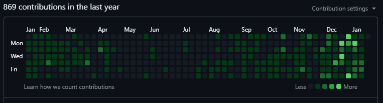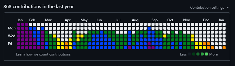 The chart has 53 columns (basically a full year) and 7 rows (Sunday through Saturday). That gives us a 53x7 grid to play with. Not huge, but enough to display scrolling text or simple graphics.