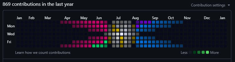 retroWave: ['#FF6EC7', '#FF4081', '#FF00BF', '#EA00D9', '#BF00FF', '#8E00FF', '#7200FF']The setter() function maps contribution intensity to these colors. Low activity? Dark colors. High activity? Bright, vibrant colors. I also added two color picking modes: