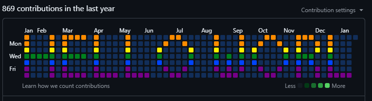 The chart has 53 columns (basically a full year) and 7 rows (Sunday through Saturday). That gives us a 53x7 grid to play with. Not huge, but enough to display scrolling text or simple graphics.