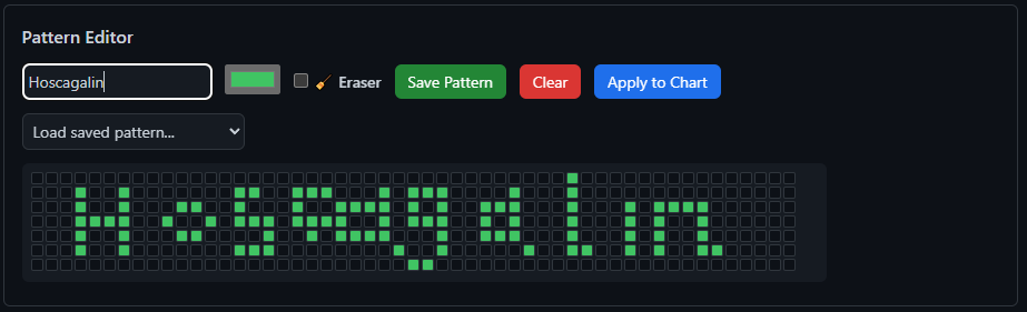 After getting the text animation working, I wanted more flexibility. What if people wanted to draw custom designs? Maybe a heart, a logo, or pixel art? That's when I built the pattern editor—a tool that lets you draw directly on a grid that matches GitHub's contribution chart, then save designs for later or apply them immediately.