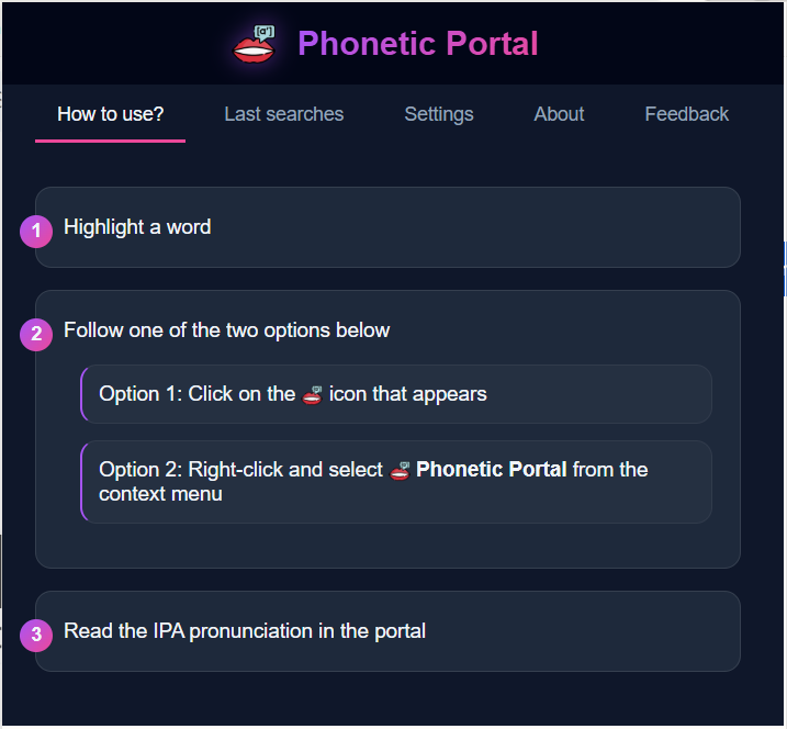 Opens a portal and displays the phonetic pronunciation of the highlighted word. Phonetic Portal is a simple and basic tool designed to help users understand and pronounce words using the International Phonetic Alphabet (IPA). Whether you're a linguist, language learner, or just curious about phonetics, this application provides an easy and intuitive way to convert words into their phonetic representation. Built in collaboration with https://github.com/Ksenofanex